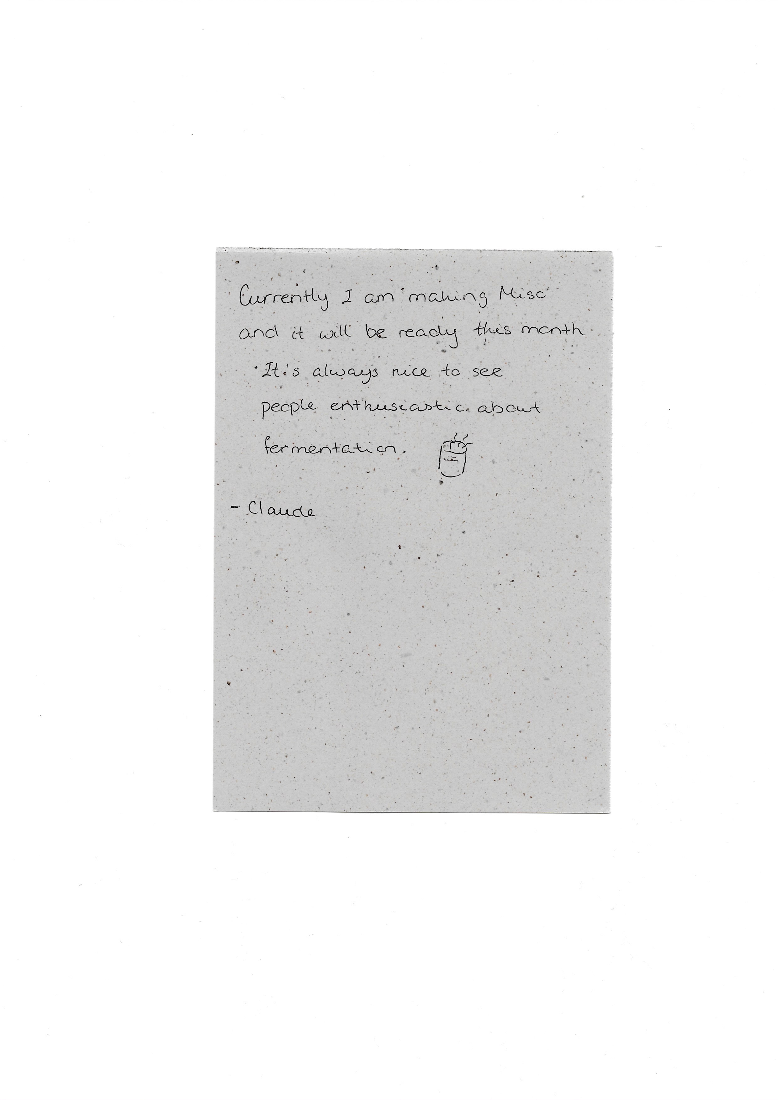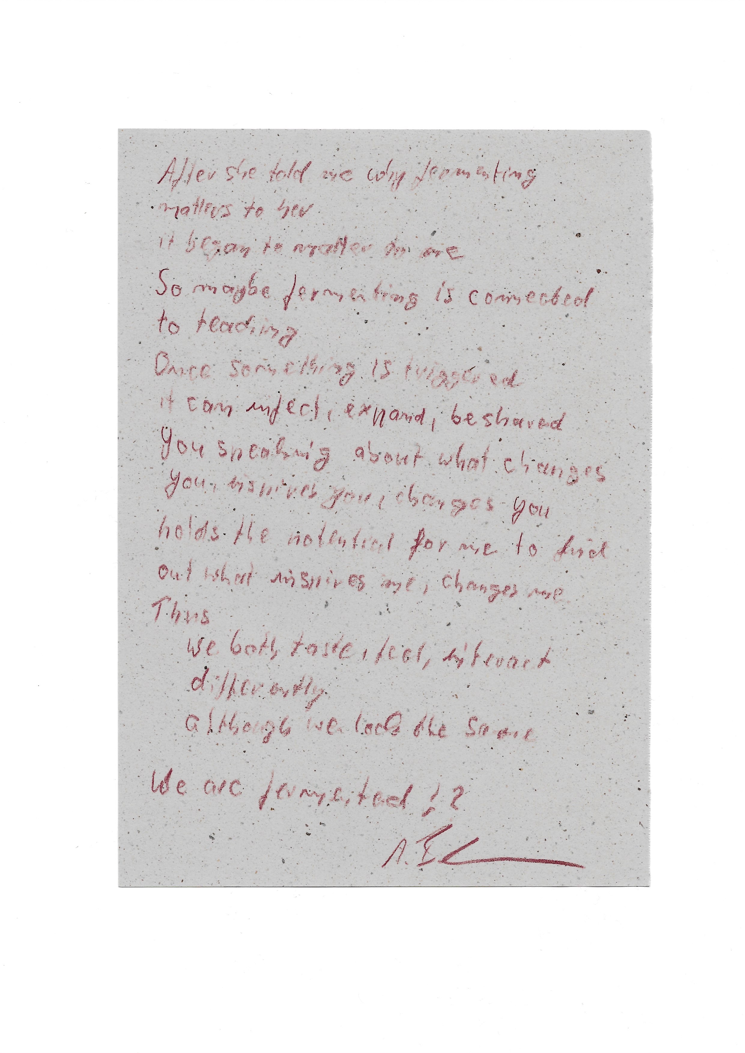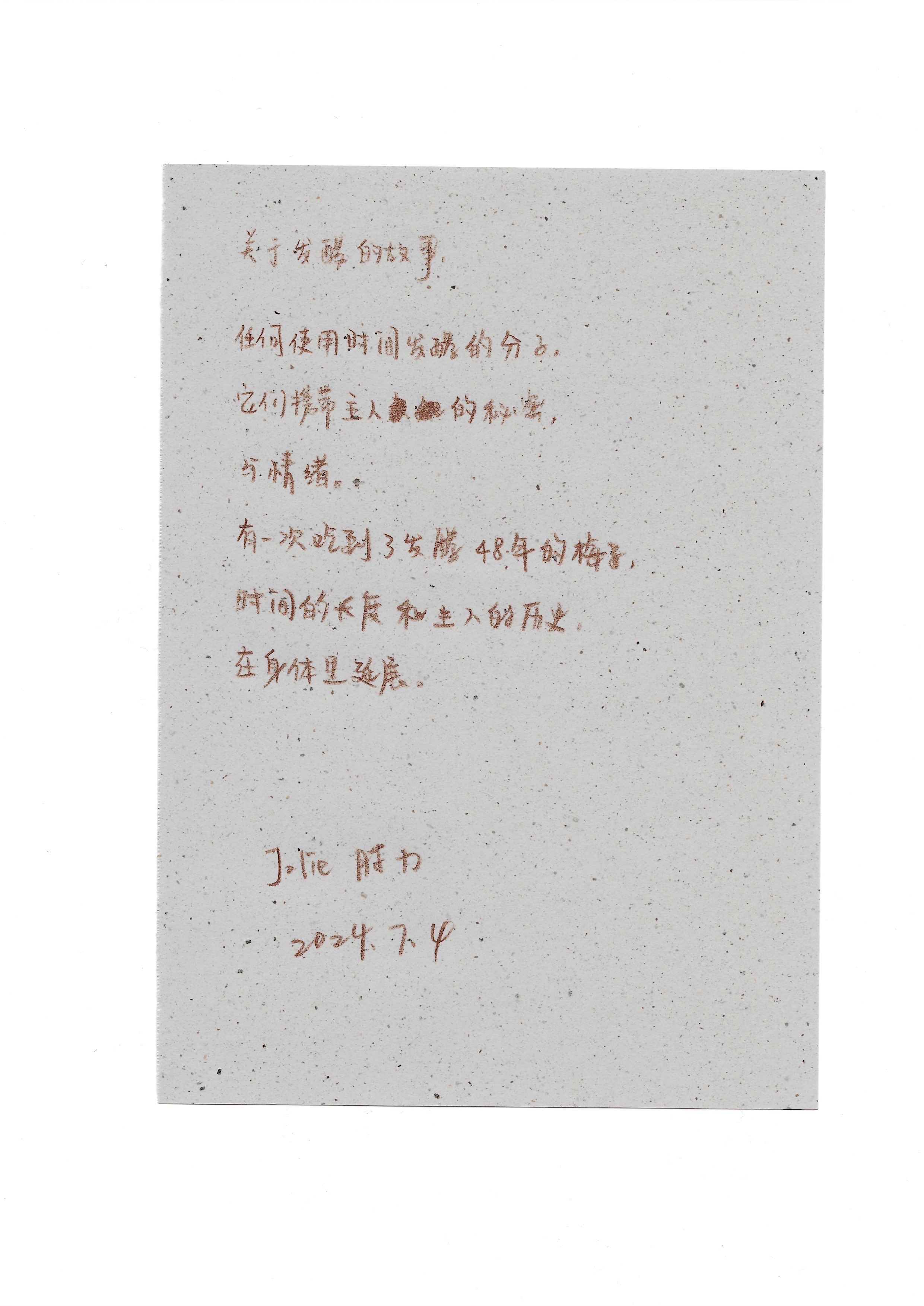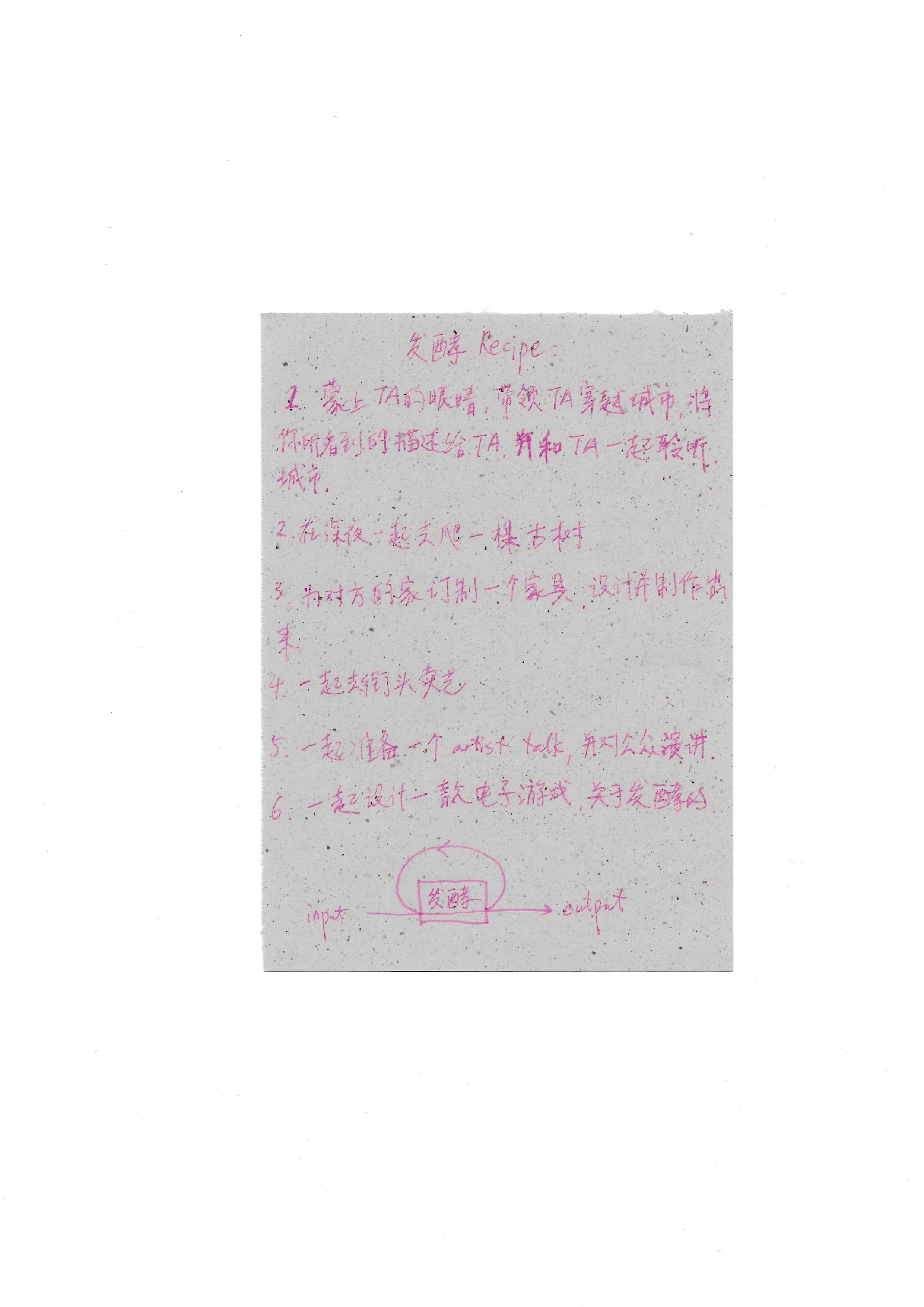 In the process of fermentation, our expectations, imaginations and narratives are connected through invisible microorganisms. Through exchanging and gifting, we intertwine in the minuatiae and then create non-verbal and non-material possibilities.